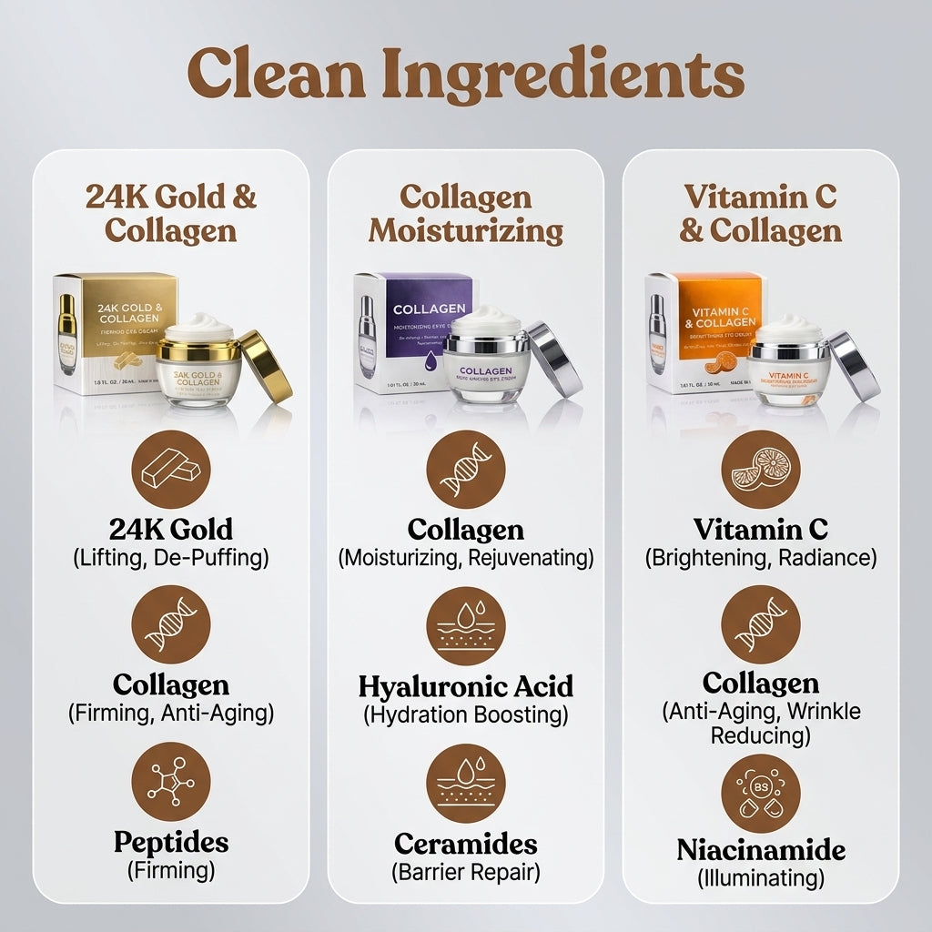Elevate your skincare routine with this Ultimate Korean Eye Cream Trio, a luxurious 3-piece system designed to target every major under-eye concern—hydration, brightness, and firmness. This curated set combines three powerful formulas: Collagen Moisturizing Eye Cream for deep hydration and smoothing Vitamin C & Collagen Eye Cream for brightening and revitalizing 24K Gold & Collagen Eye Cream for lifting and firming Each cream works synergistically to deliver a complete anti-aging solution, helping reduce the appearance of fine lines, dark circles, puffiness, and loss of elasticity. Inspired by advanced Korean skincare, this trio provides both instant radiance and long-term skin improvement. Perfect for those who want a high-end, results-driven routine that transforms tired eyes into a smoother, brighter, and more youthful look. ✨ The 3-Step Eye Transformation System 1. Hydrate & Smooth (Collagen Eye Cream) Deeply moisturizes delicate skin Softens fine lines Improves skin texture and elasticity 2. Brighten & Revitalize (Vitamin C + Collagen Eye Cream) Helps reduce dark circles Boosts radiance and glow Evens under-eye tone 3. Lift & Firm (24K Gold + Collagen Eye Cream) Enhances firmness and elasticity Helps reduce puffiness Gives a lifted, youthful appearance Collagen (All 3 Formulas) Supports skin elasticity and helps smooth wrinkles. Vitamin C (Brightening Cream) Brightens dull skin and helps reduce dark circles. 24K Gold (Firming Cream) Enhances radiance and supports skin firmness. Hydrating & Nourishing Complex Helps maintain moisture balance and strengthen skin barrier.