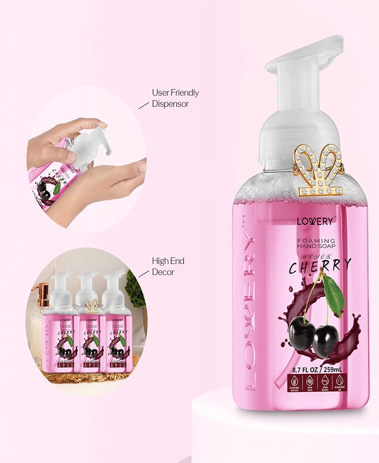 Keep your hands feeling clean, nourished, and luxuriously scented with our Liquid Hand Soaps. The sweet, sultry notes of Black Cherry Fragrance will take you far away in paradise. Awaken your senses with the tropical, citrusy notes in this fresh fragrance! Compared to traditional soap, this Foaming Hand Wash is more efficient, hygienic, and environmentally friendly. It contains natural moisturizers which leave your hands velvety soft and smooth – safe for small hands. Every Lovery beauty product is Paraben and Cruelty Free.