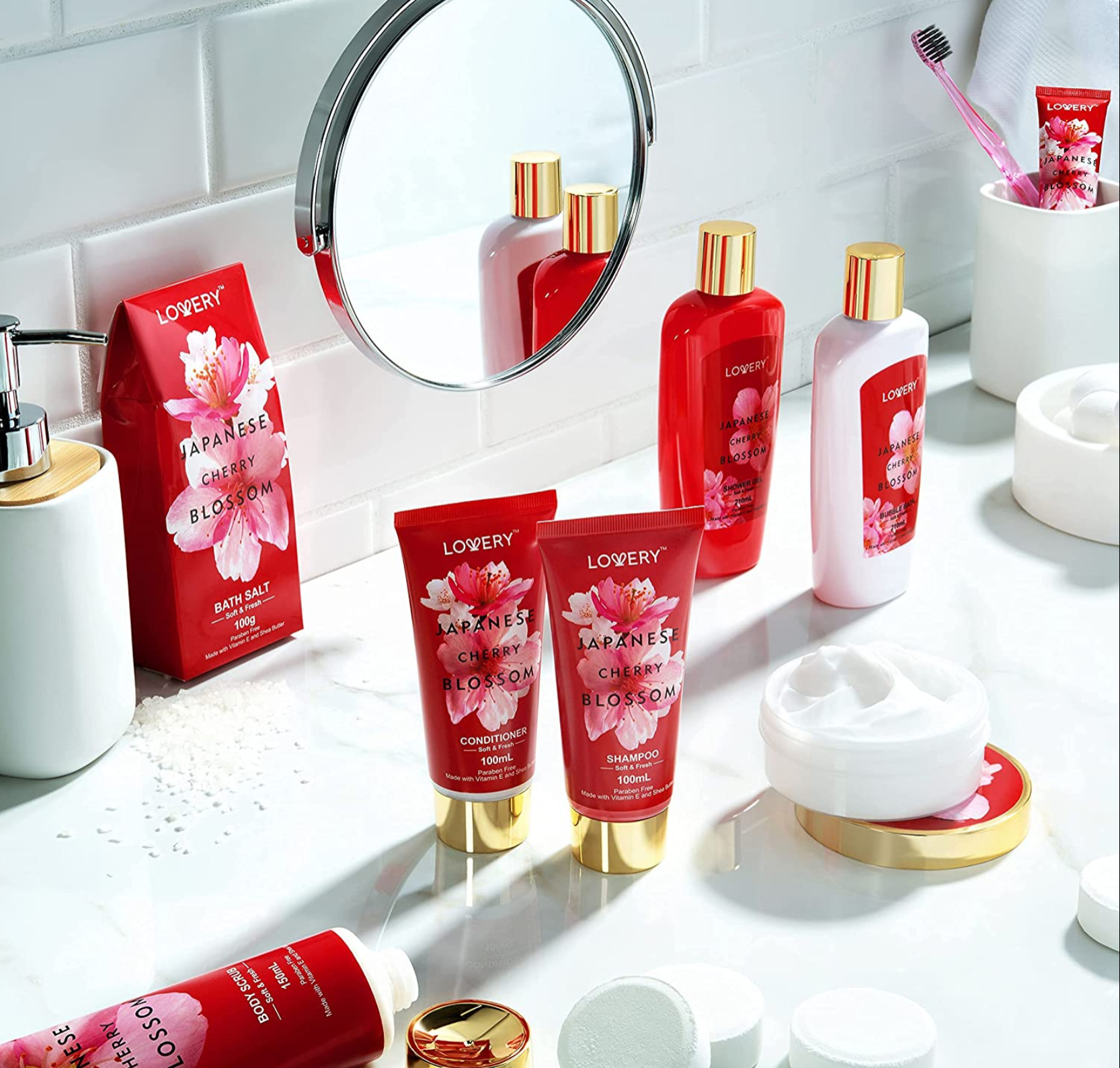 Indulge in a home spa using Japanese Cherry Blossom oils. These bath and body cosmetics are not only beautiful, but rich in antioxidants and essential fatty acids. Known for their soothing properties, cherry blossoms are perfect for an invigorating and indulgent spa experience! Our Bath Spa Kit creates a complete self-care package for Women, Men and Teens. It is formulated with all-natural ingredients, with Vitamin E and Shea Butter, which leaves your skin luxuriously scented, smooth, and hydrated. It also helps prevent dryness and flakiness and keeps skin moisturized and supple. Every Lovery product is 100% Paraben and Cruelty-Free.