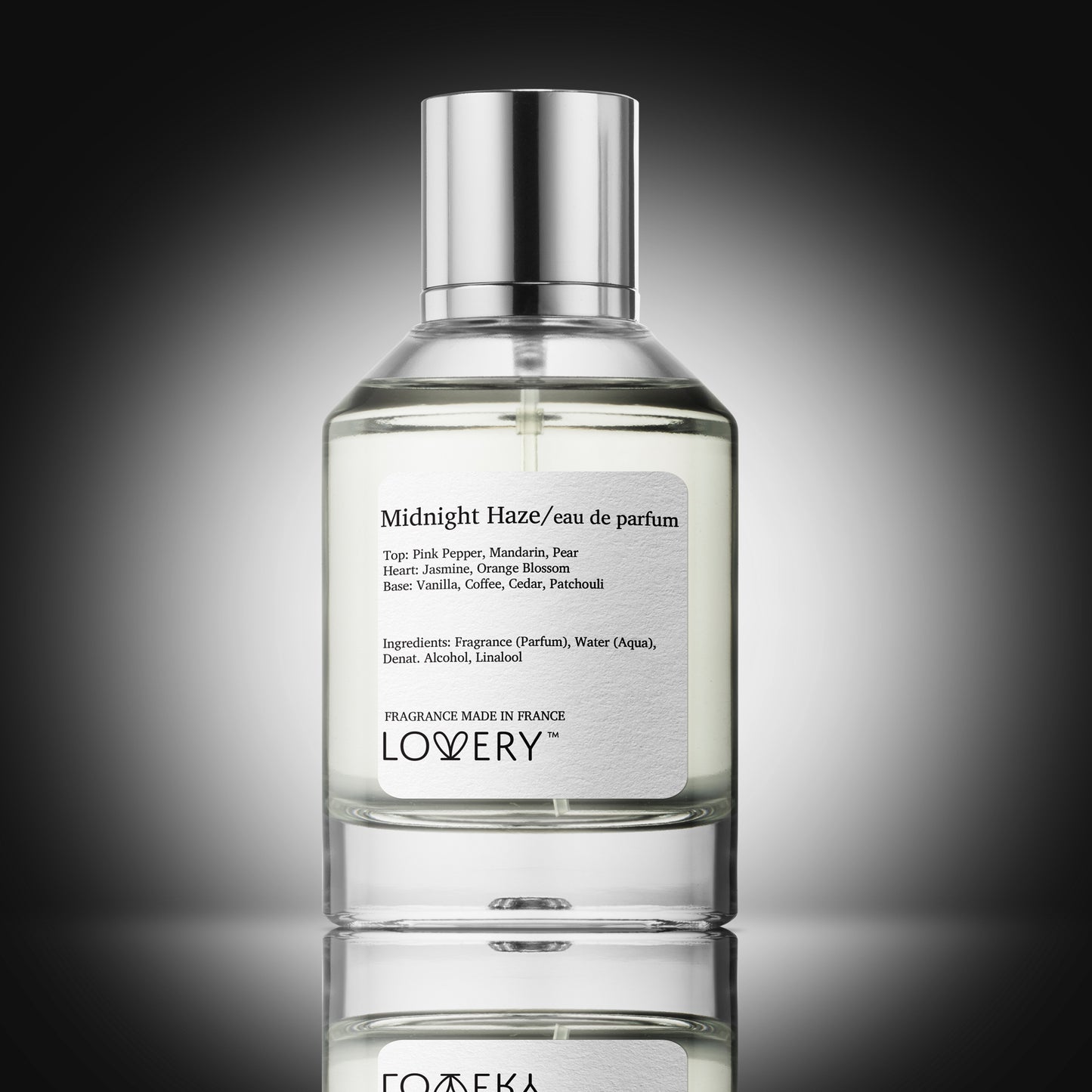 Our Midnight Haze fragrance embodies modern femininity with sparkling top notes of pink pepper, mandarin, and pear, a radiant heart of jasmine and orange blossom, and a sensual base of vanilla, coffee, cedar, and patchouli.