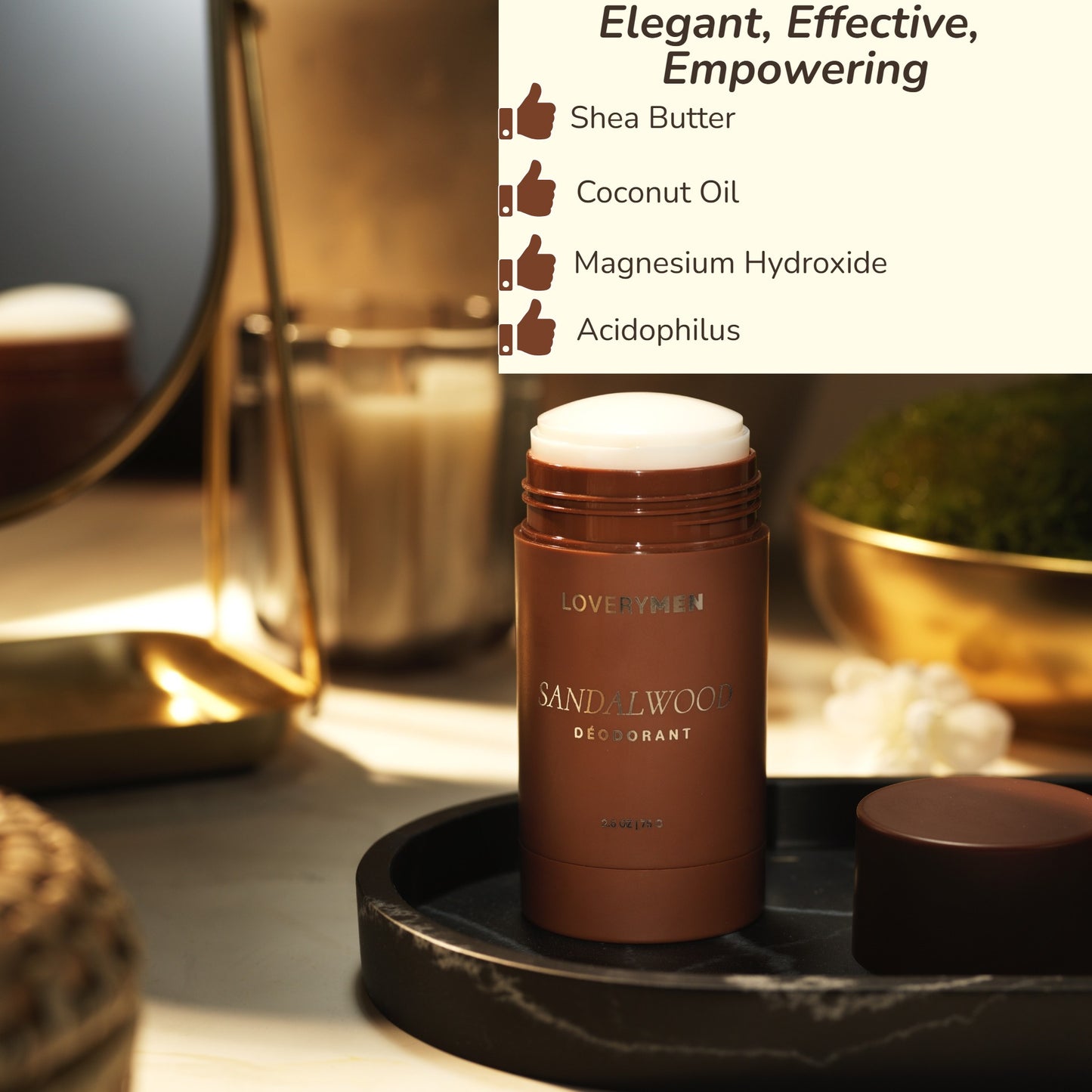 Choose LOVERY for a deodorant that combines premium ingredients with sophisticated scents, perfect for the discerning man. Discover the difference of aluminum-free deodorant and enjoy 24-hour protection that aligns with your lifestyle. Order your 4-pack today and experience the elegance of LOVERY!* 75g Sea Salt Deodorant Stick * 75g Eucalyptus Deodorant Stick * 75g Amber Deodorant Stick * 75g Sandalwood Deodorant Stick