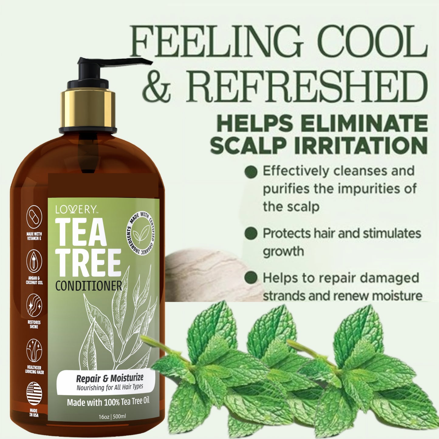 The Tea Tree hair care conditioner helps fight dandruff and scalp irritation, while also moisturizing and hydrating the hair, leaving it feeling healthy and refreshed. Formulated with a cocktail of 5 essential oils composed of tea tree oil, argan oil, coconut oil, vitamin e, jojoba oil. They are known for soothing properties and constitute an anti breakage complex of the hair fiber for repaired hair.